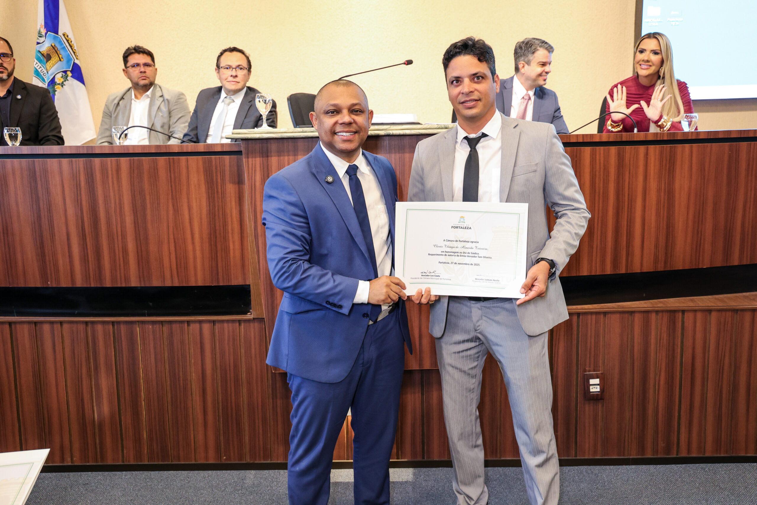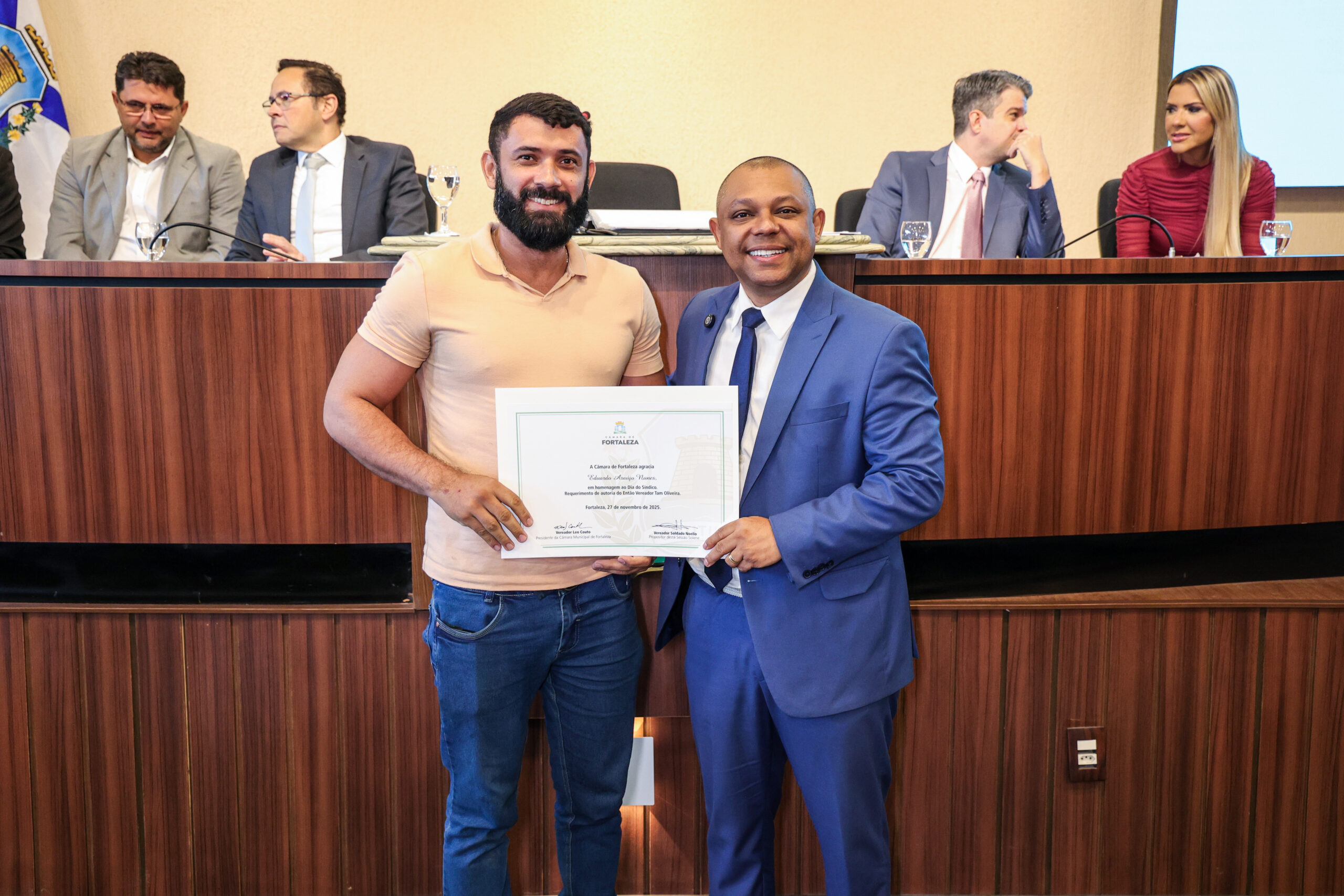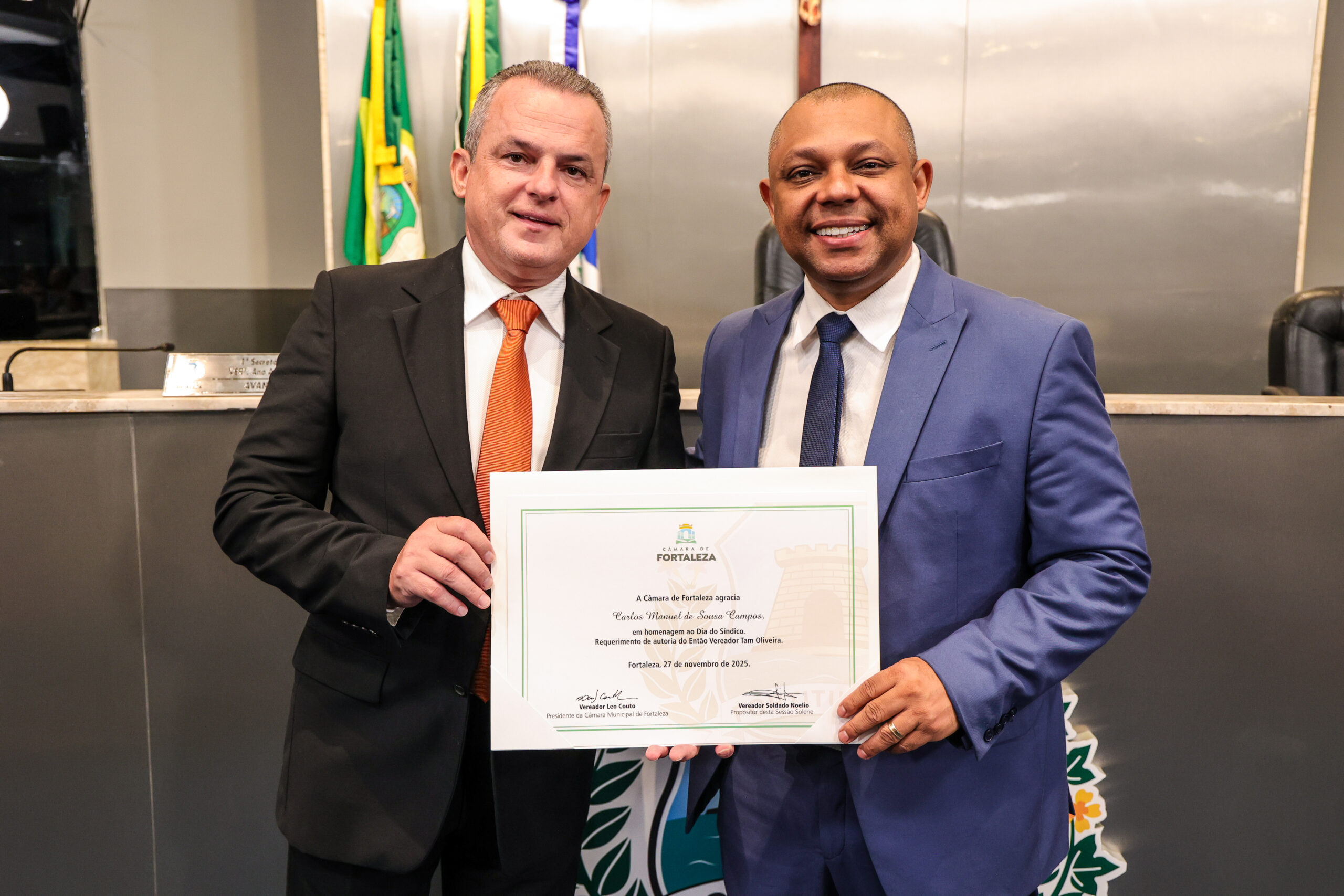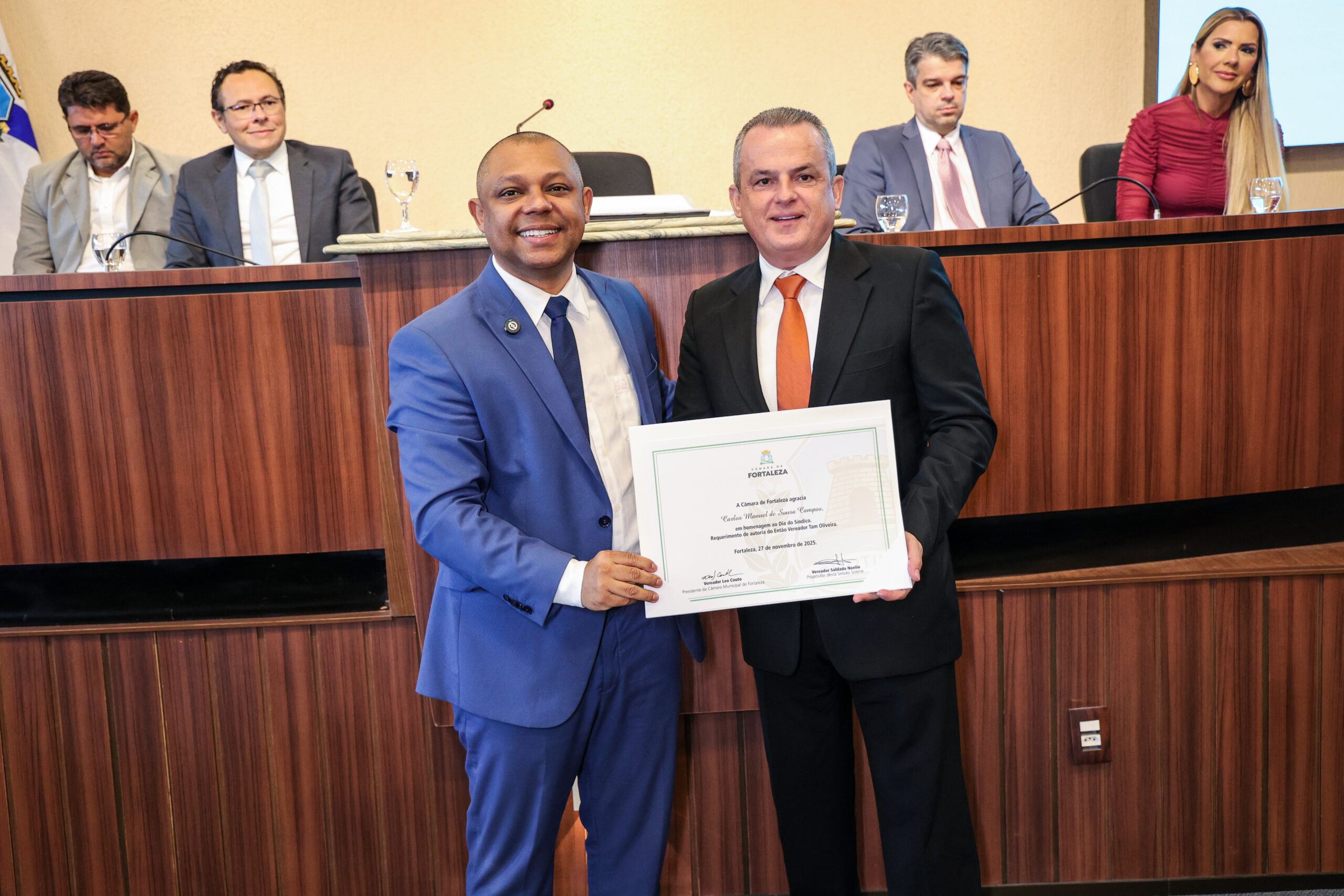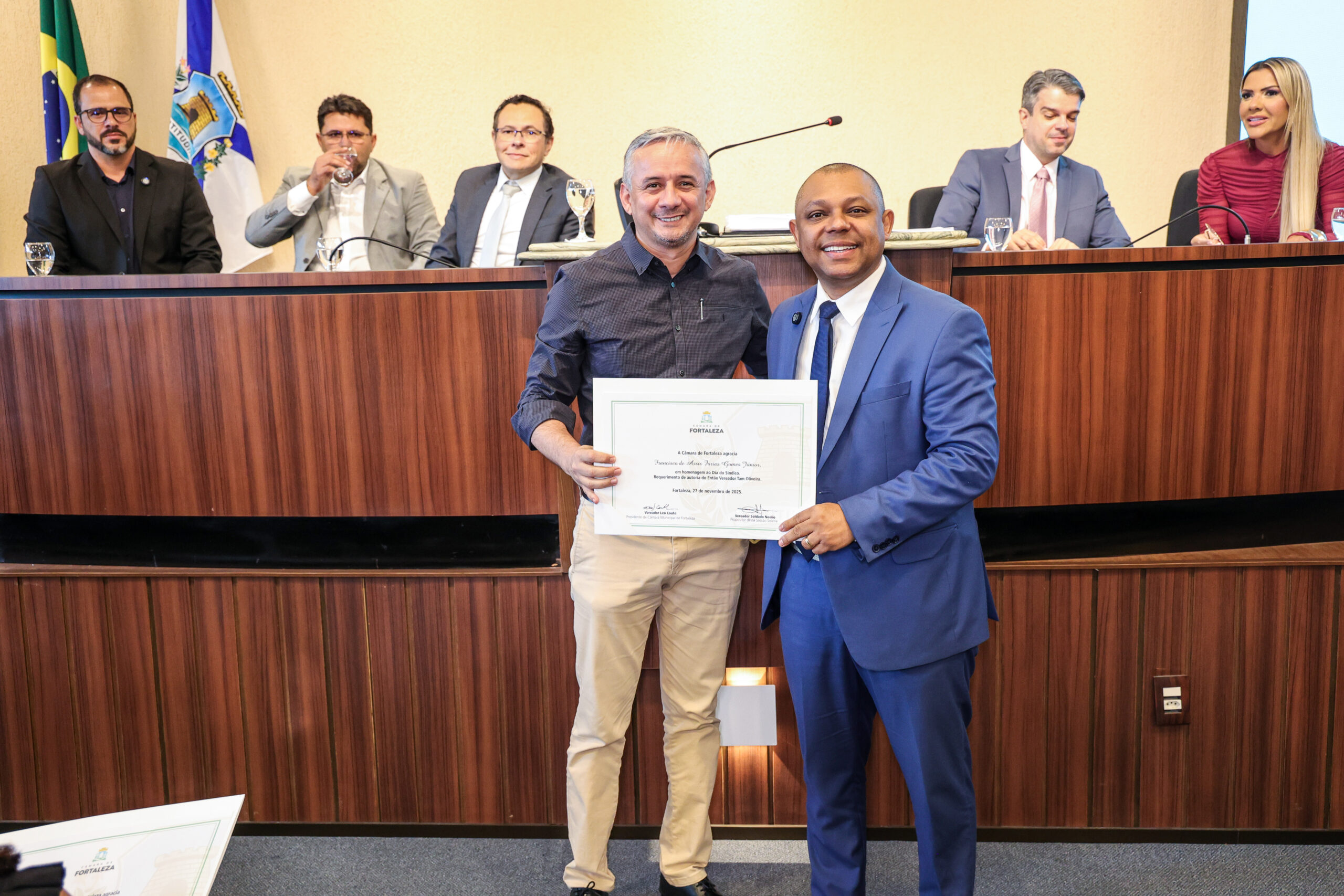 A tarde de ontem foi marcada por reconhecimento e prestígio na Câmara Municipal de Fortaleza, onde síndicos que se dedicam diariamente à vida em comunidade receberam merecidas homenagens. O requerimento, de iniciativa do vereador Soldado Noélio, foi atendido pelo presidente da Câmara, Léo Couto, e a solenidade foi conduzida pelo próprio Soldado Noélio, que reforçou a importância dos síndicos para o bom funcionamento dos condomínios na capital.