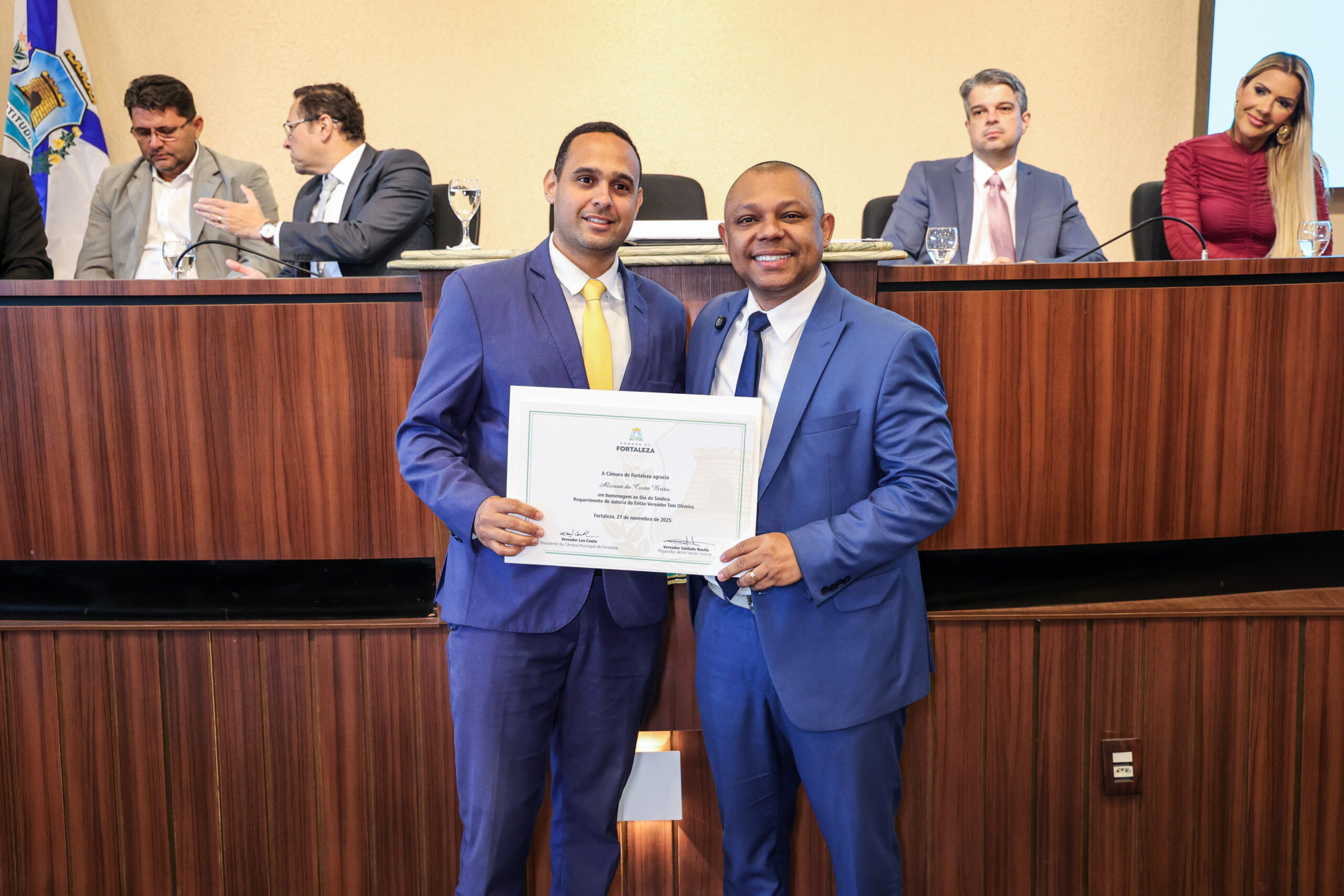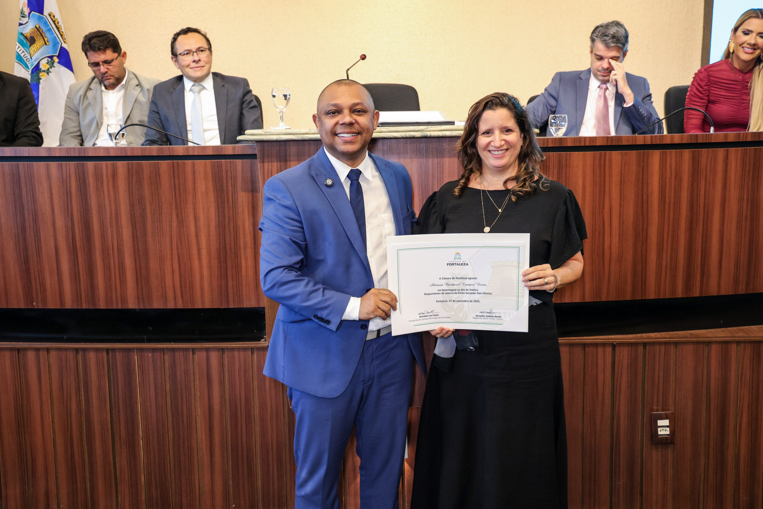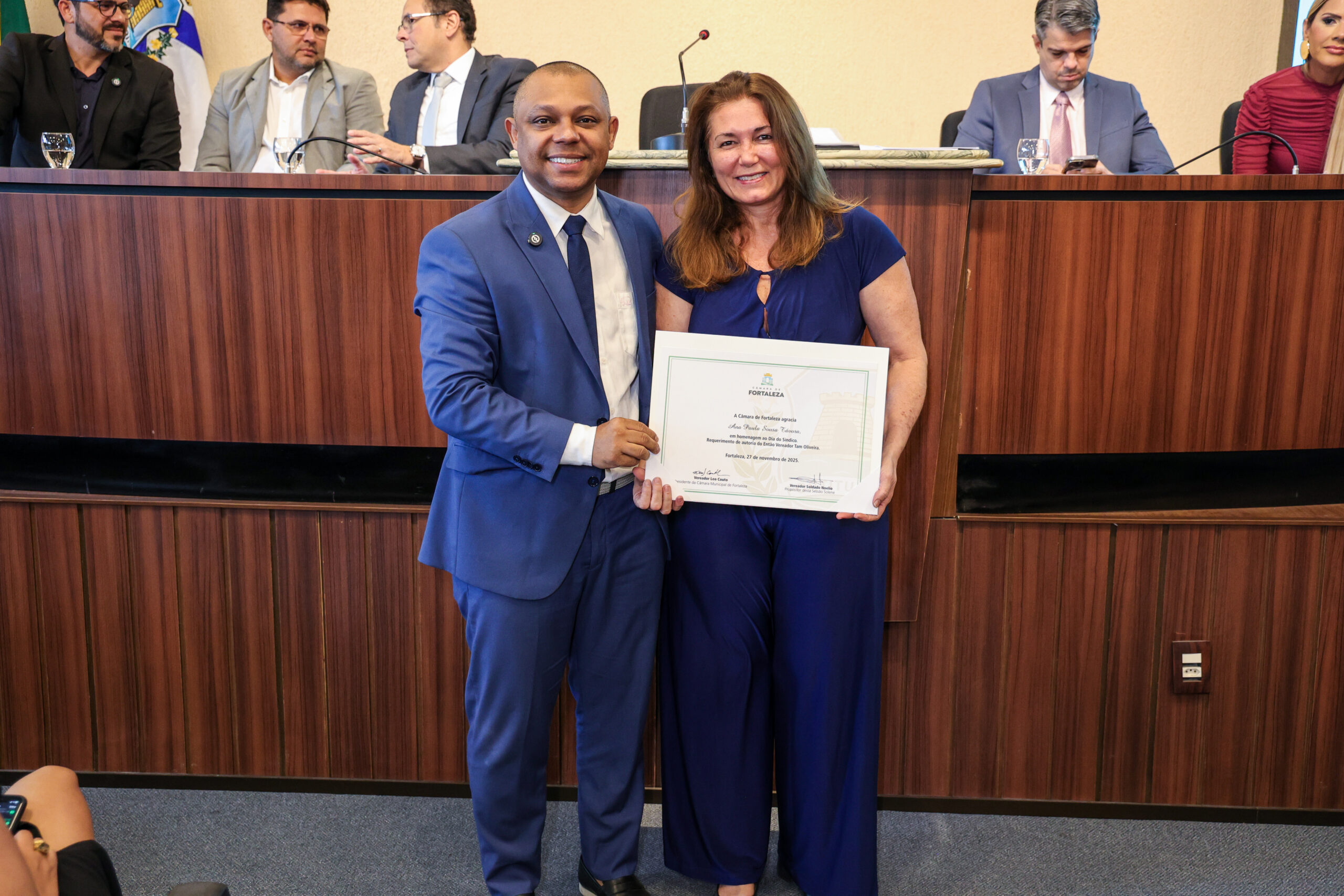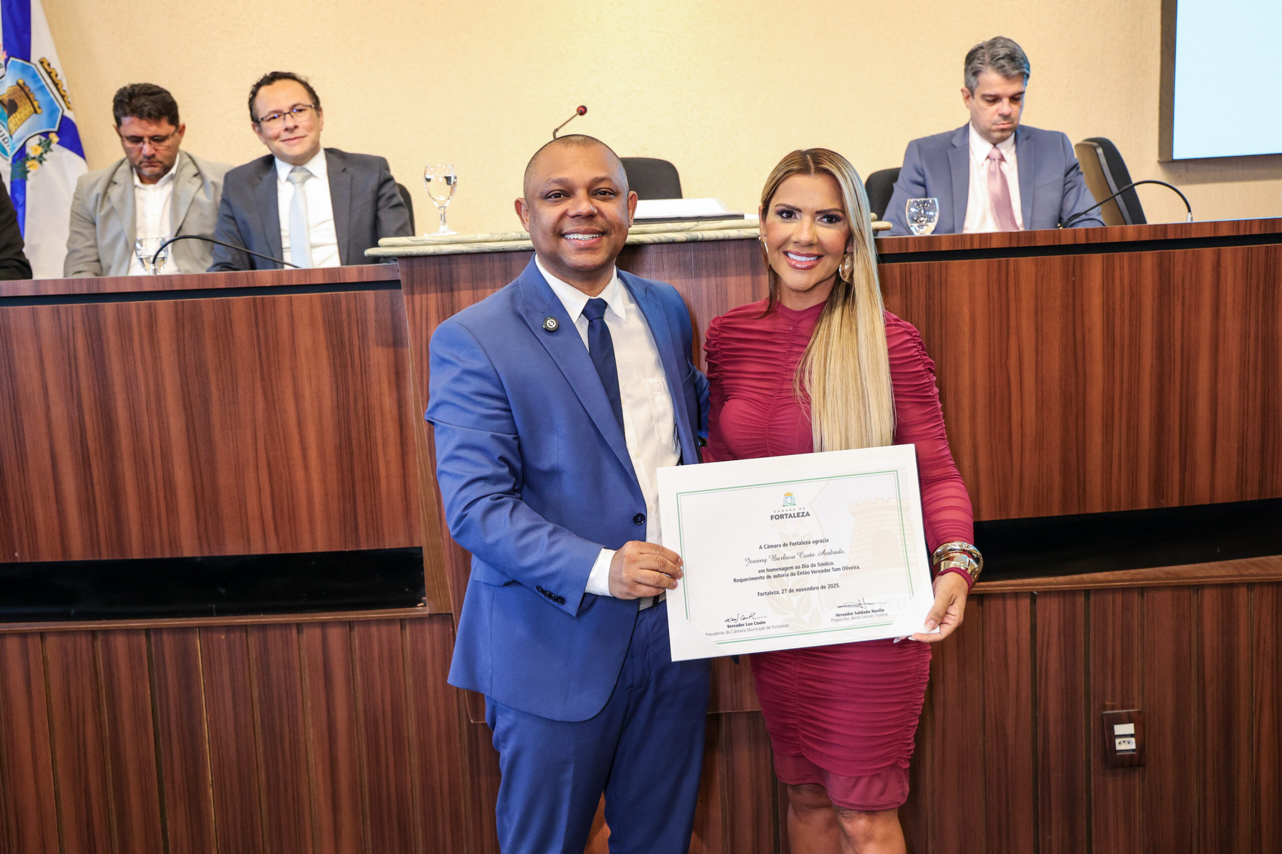 A tarde de ontem foi marcada por reconhecimento e prestígio na Câmara Municipal de Fortaleza, onde síndicos que se dedicam diariamente à vida em comunidade receberam merecidas homenagens. O requerimento, de iniciativa do vereador Soldado Noélio, foi atendido pelo presidente da Câmara, Léo Couto, e a solenidade foi conduzida pelo próprio Soldado Noélio, que reforçou a importância dos síndicos para o bom funcionamento dos condomínios na capital.