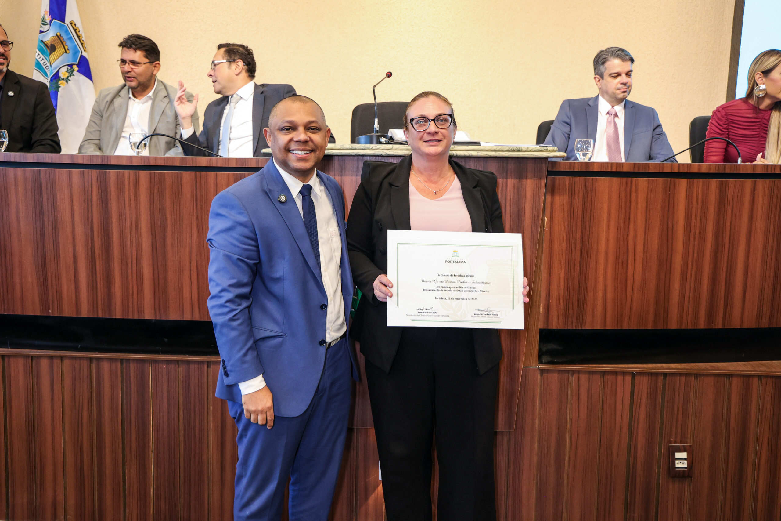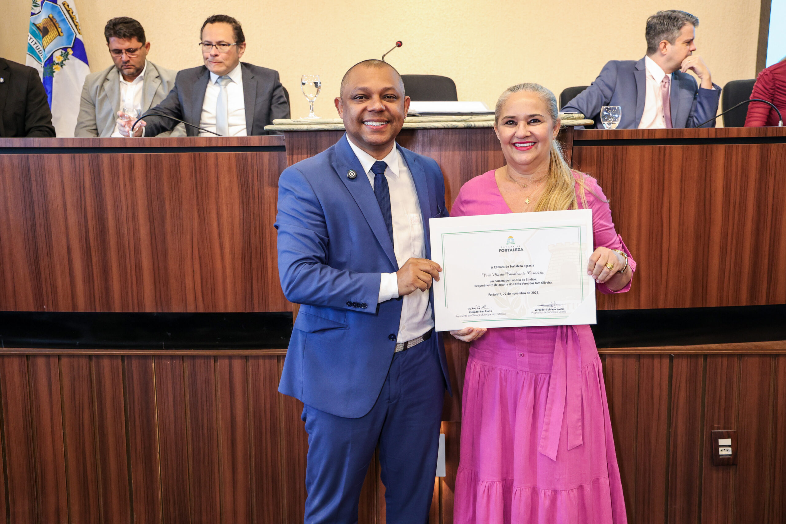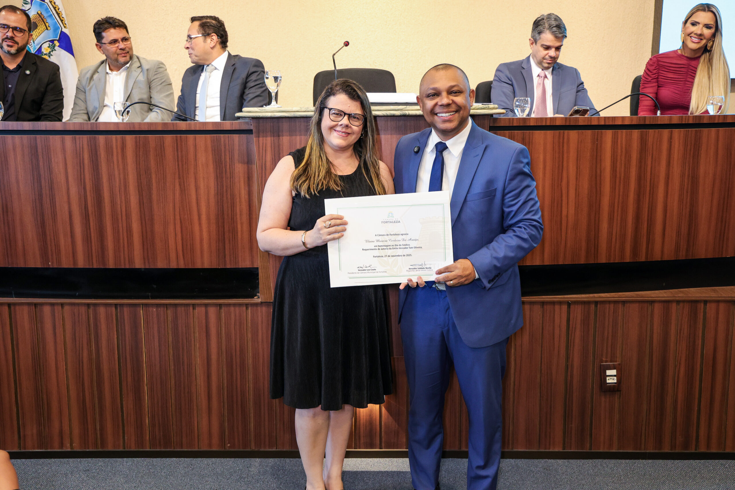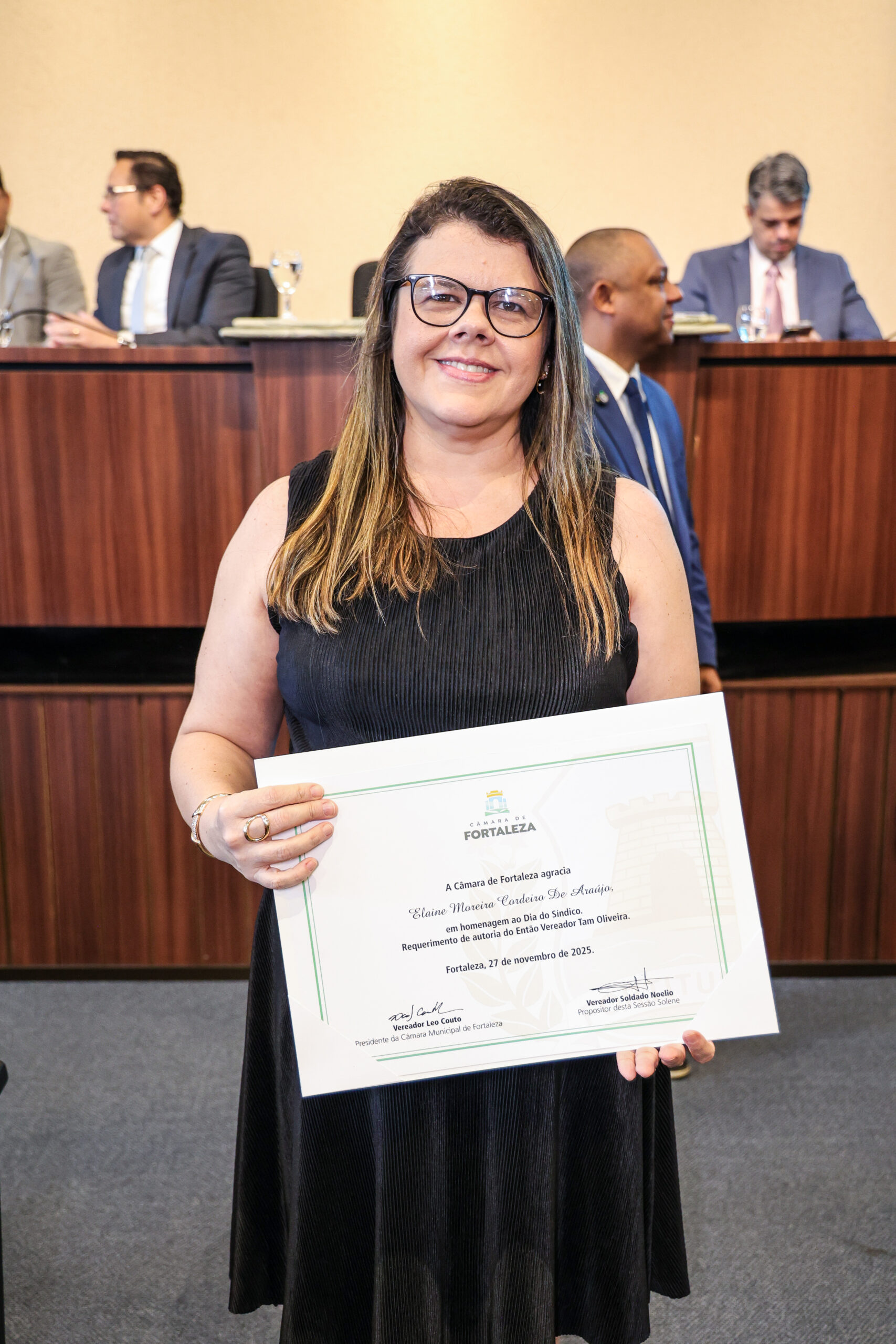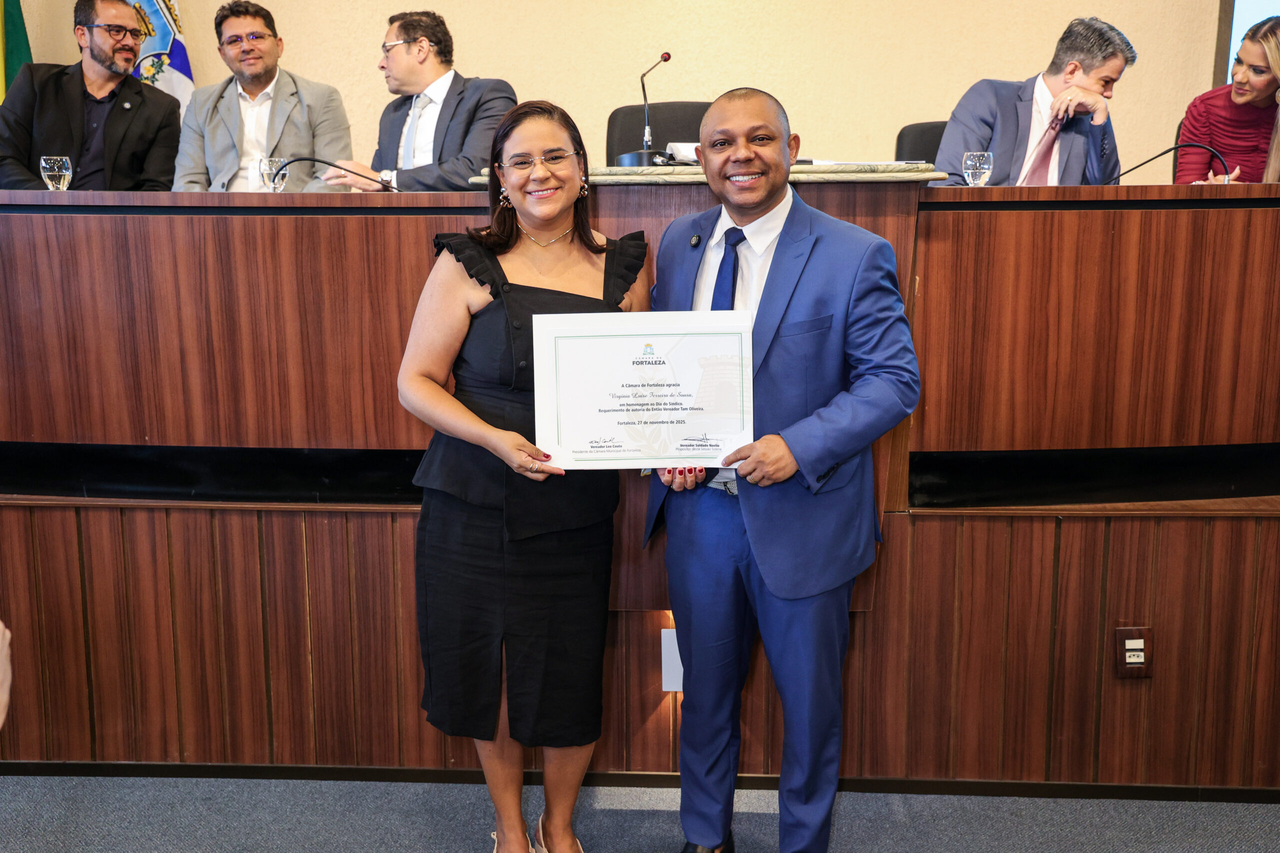 A tarde de ontem foi marcada por reconhecimento e prestígio na Câmara Municipal de Fortaleza, onde síndicos que se dedicam diariamente à vida em comunidade receberam merecidas homenagens. O requerimento, de iniciativa do vereador Soldado Noélio, foi atendido pelo presidente da Câmara, Léo Couto, e a solenidade foi conduzida pelo próprio Soldado Noélio, que reforçou a importância dos síndicos para o bom funcionamento dos condomínios na capital.