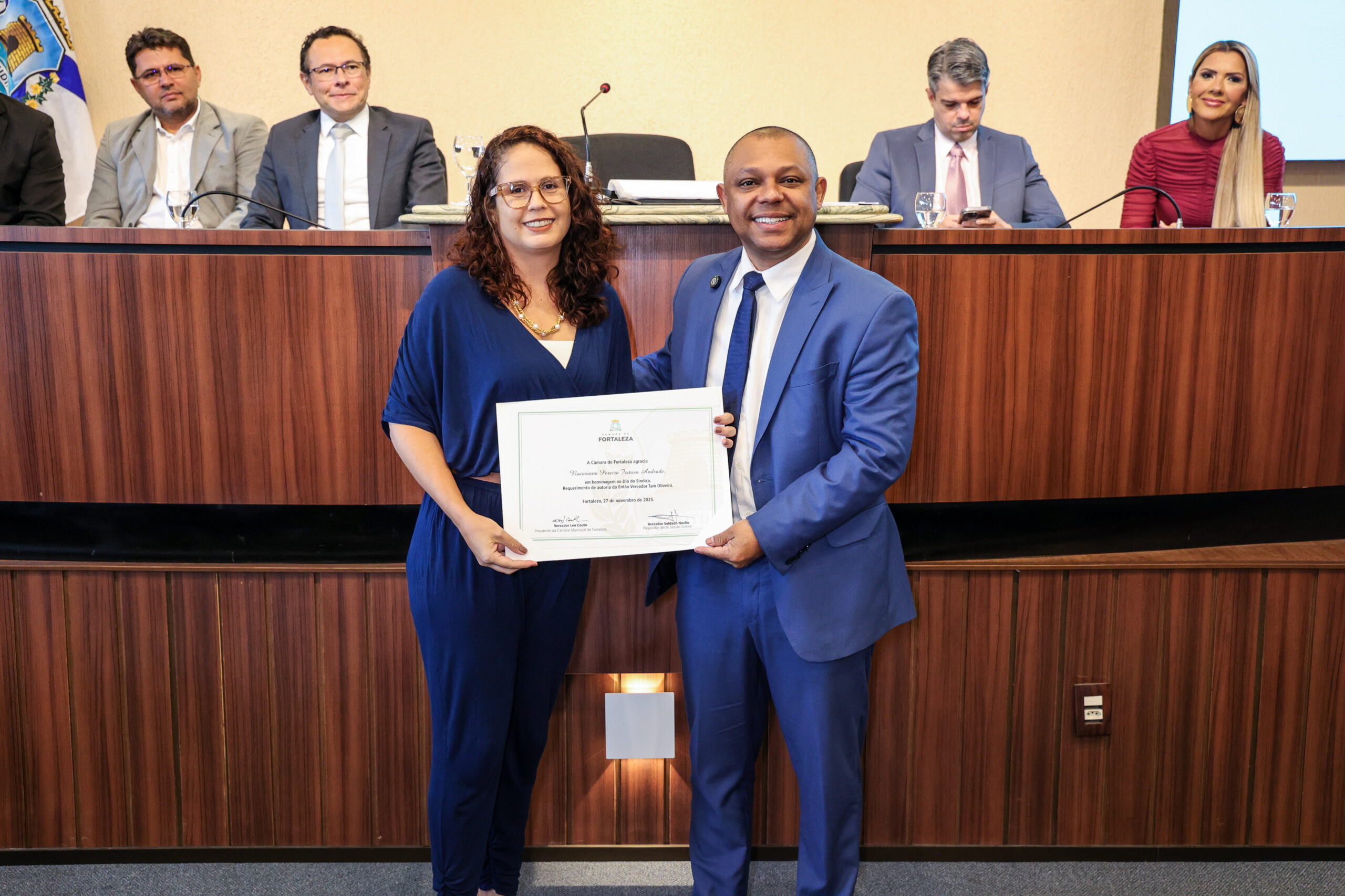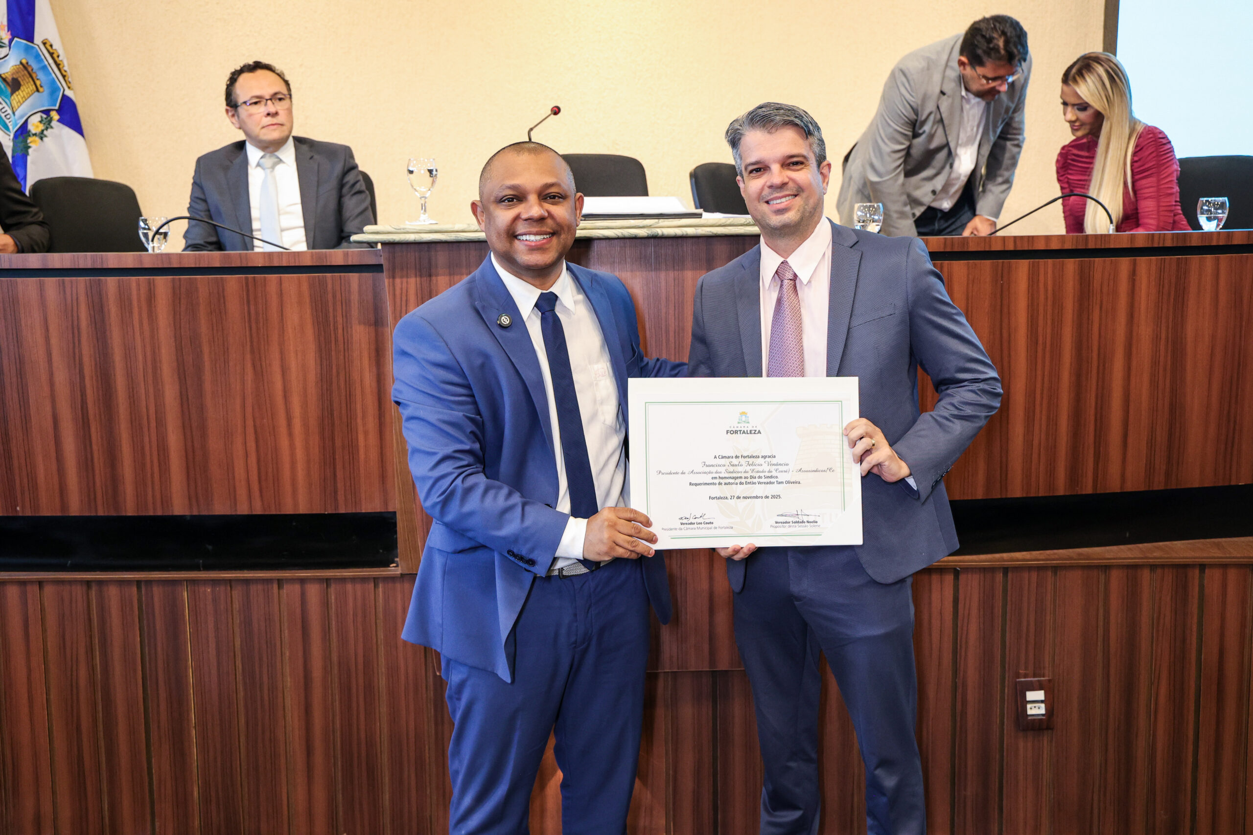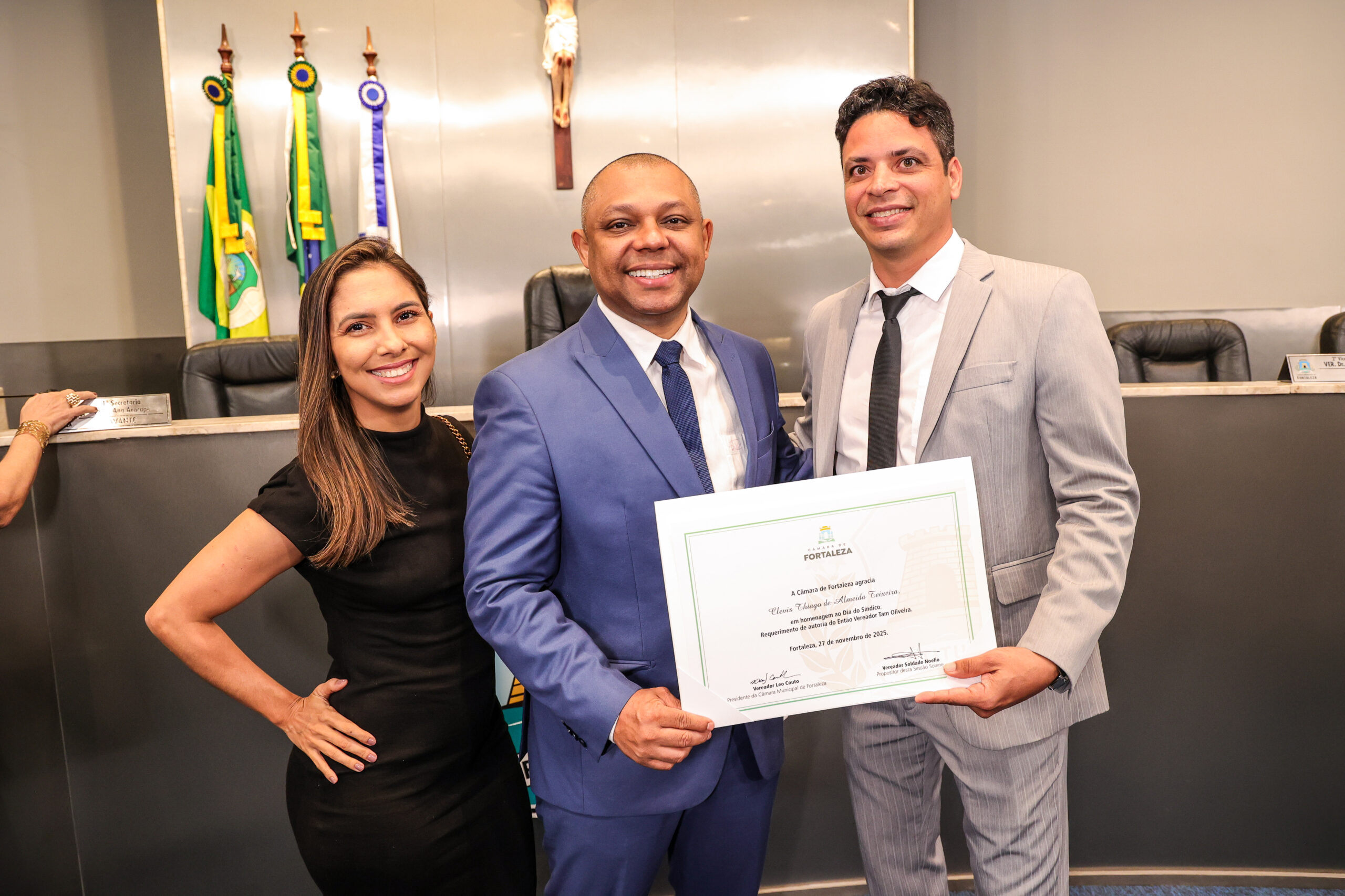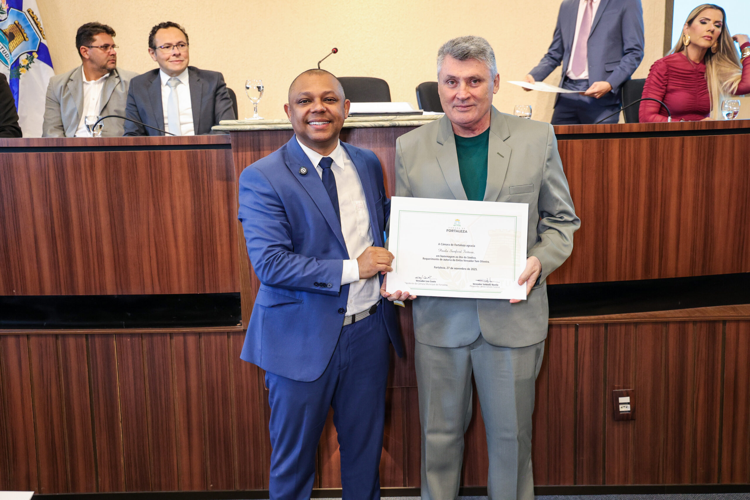A tarde de ontem foi marcada por reconhecimento e prestígio na Câmara Municipal de Fortaleza, onde síndicos que se dedicam diariamente à vida em comunidade receberam merecidas homenagens. O requerimento, de iniciativa do vereador Soldado Noélio, foi atendido pelo presidente da Câmara, Léo Couto, e a solenidade foi conduzida pelo próprio Soldado Noélio, que reforçou a importância dos síndicos para o bom funcionamento dos condomínios na capital.